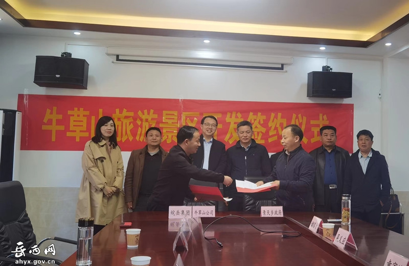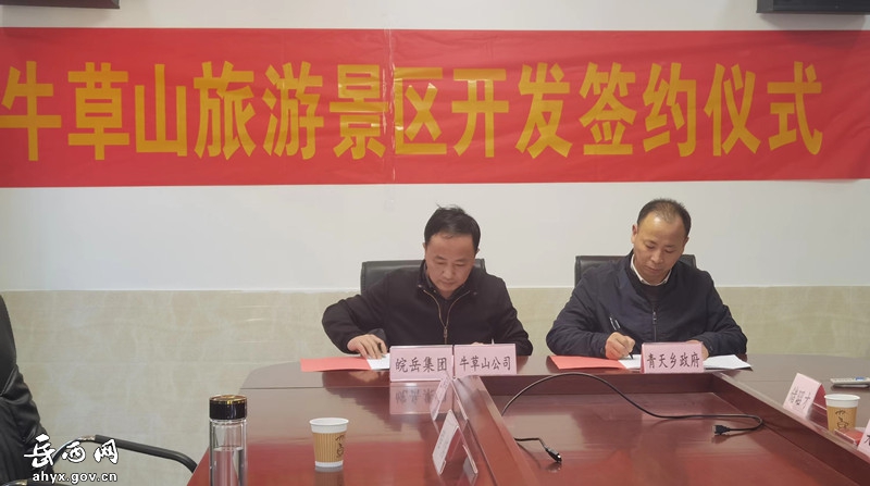 2022年3月15日上午,牛草山公司与青天乡政府在牛草山举行了“关于合作开发建设牛草山旅游景区项目”签约仪式。青天乡党委书记童家峰,皖岳集团党委书记、董事长、总经理王贻峰,青天乡及项目涉及村两委负责人共同出席签约仪式。