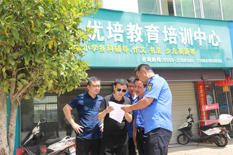 6月9日,中关教育党总支践行“一改两为”,联合中关镇综合行政执法大队、五河市场监督管理所,组成联合检查组,再次开展校外培训机构专项治理行动。