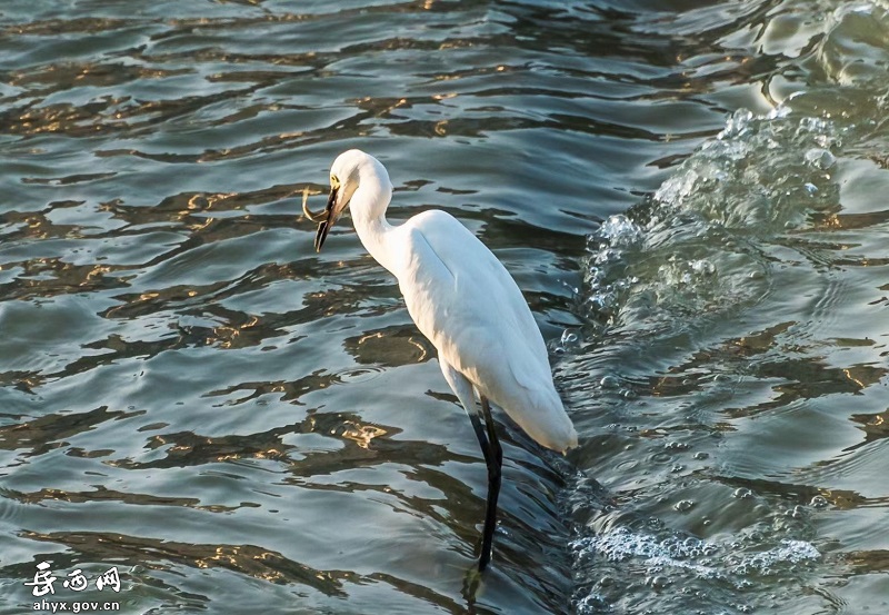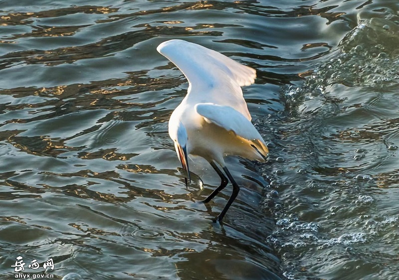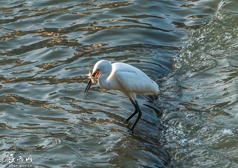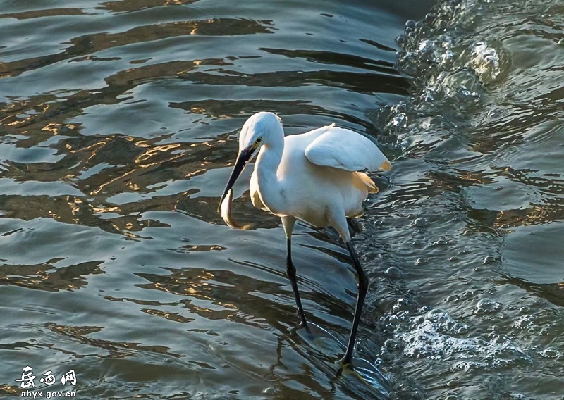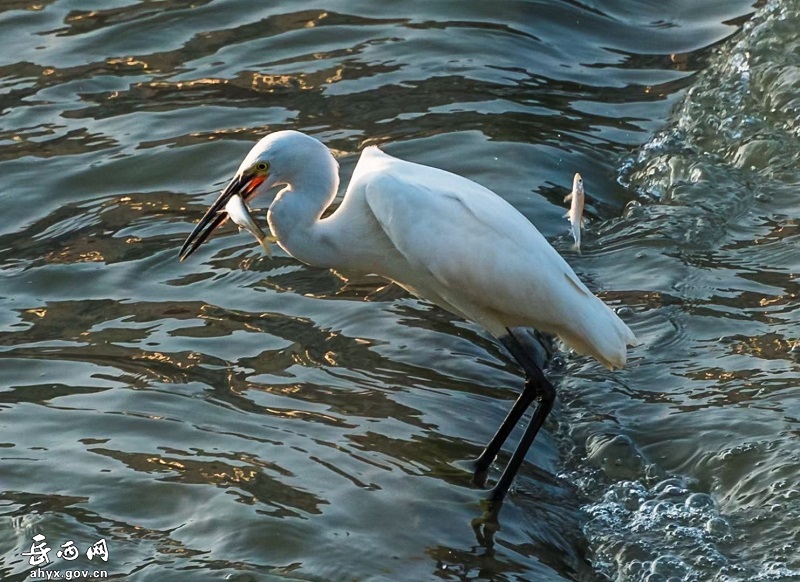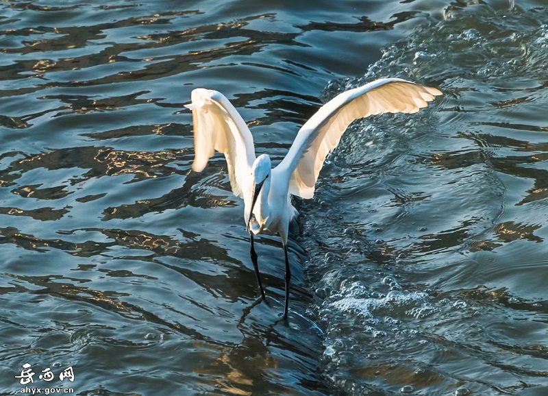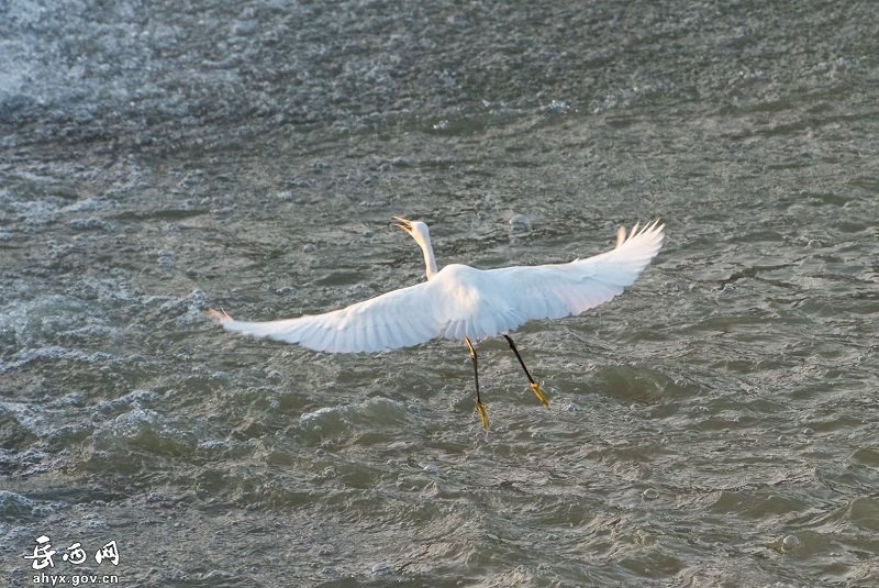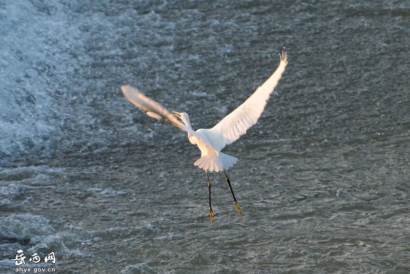 安徽省岳西县天堂镇衙前河边成群的白鹭或展翅起舞,或追逐嬉戏,或闲庭信步,或栖息觅食,构成了一幅美丽的生态画卷。