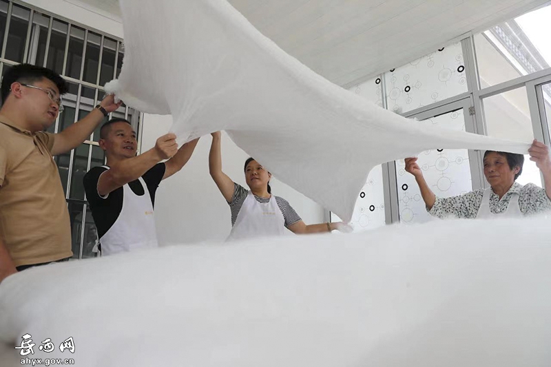省农科院蚕桑科技特派团专家徐浩(左一)深入岳西县蚕丝被加工企业,帮助蚕农解决生产中的技术问题 徐国康/摄