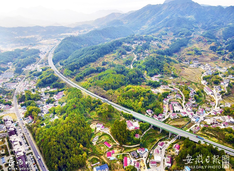 秋日的岳西县天堂镇木冲社区,六潜高速、318国道、通村达户的公路与山川、民居交相辉映,构成一幅色彩斑斓的乡村画卷。 近年来,岳西县在推进美丽乡村建设过程中,不断提速提质山区公路建设,形成布局合理、内通外联、班车到村、人便于行、衔接紧密的交通运输网络,为乡村旅游和促进产业发展打下了坚实的基础。