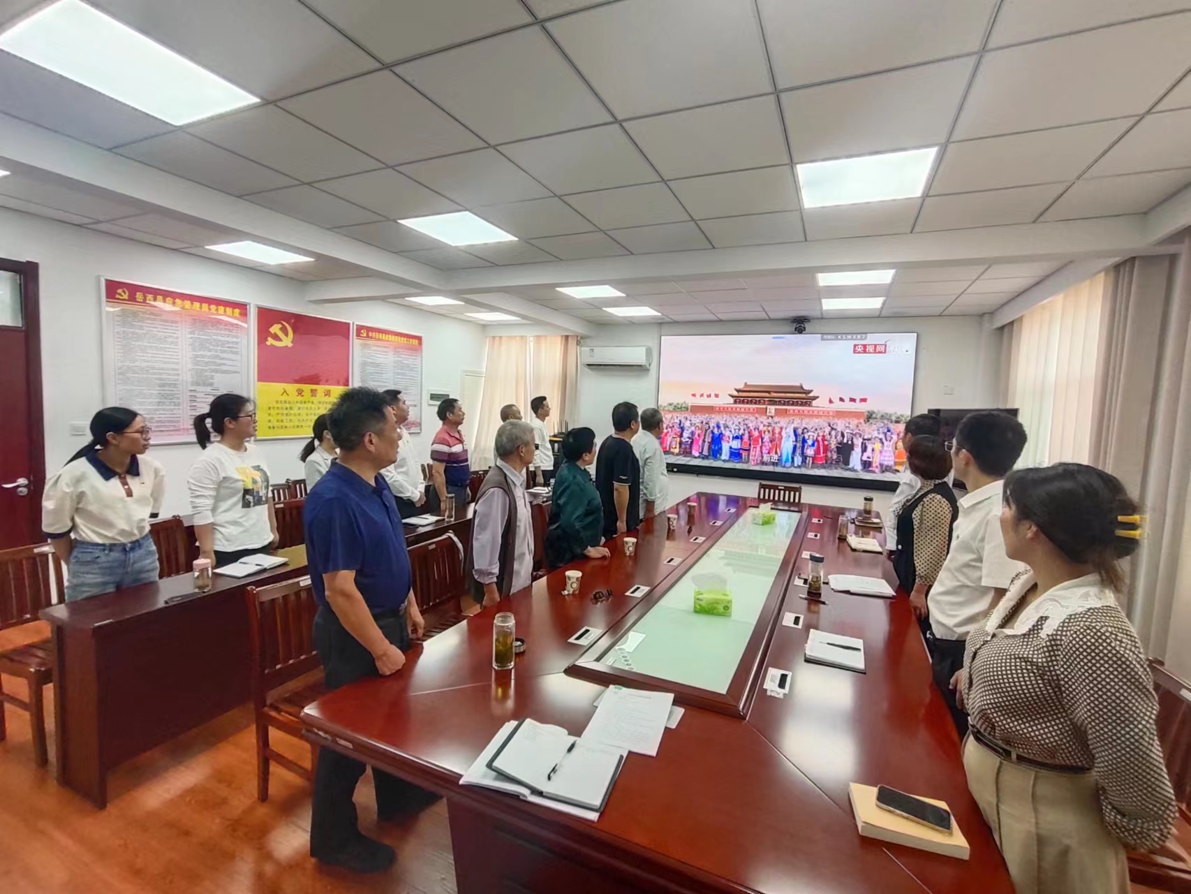 下午县应急局党支部组织在职和退休党员在局机关三楼会议室同唱国歌,同观警示教育电影,并对退休老党员进行了重阳节慰问。党员同志们统一佩戴党徽,肃立高歌,热情激昂。