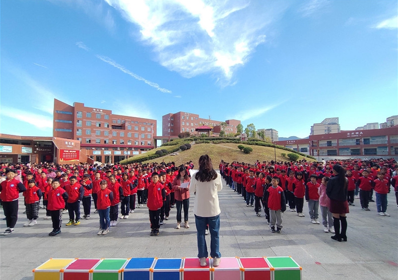 课间操时间,该校师生齐聚中心广场、足球场,参加“科技节”启动仪式。升国旗、奏国歌后,该校副校长丁岳介绍举办科技节的意义,就有关活动的具体时间作了安排。该校学生代表队在彩旗手带领下入场,在“卷轴”展板上写下自己的名字。