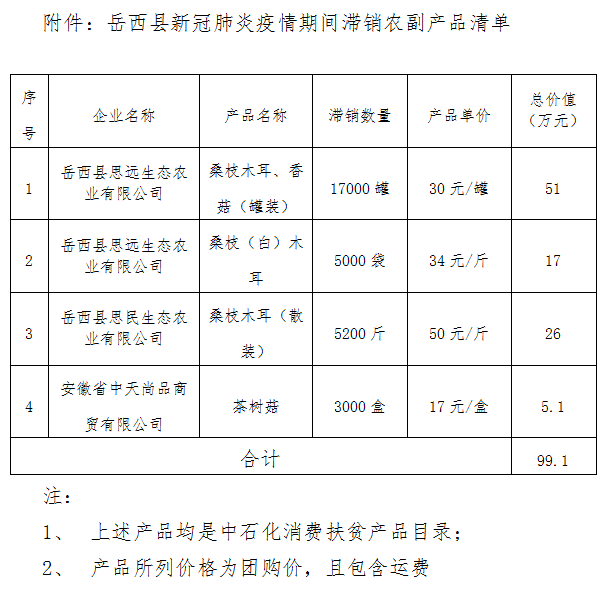 中国石化集团拟从岳西县定点采购一批滞销农副产品,捐赠湖北省抗疫一线,现将具体情况公示如下: