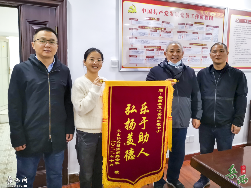 听了锦旗背后的故事,县卫健委的同事赶紧请送锦旗的一行同志上楼,将那面“乐于助人 弘扬美德”的锦旗送到熊凤霞手中。手握锦旗,熊凤霞害羞地表示:“感谢你们!我一个小小举动,还接受锦旗,太不好意思了。感谢你们,这是一面充满正能量的锦旗,是爱的传递。”