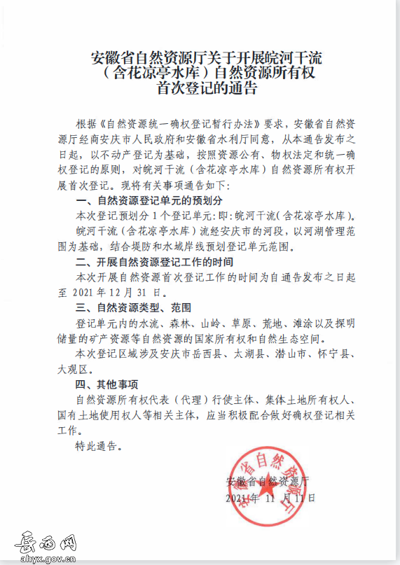 省自然资源厅关于开展皖河干流 (含花凉亭水库)自然资源所有权首次登记的通告